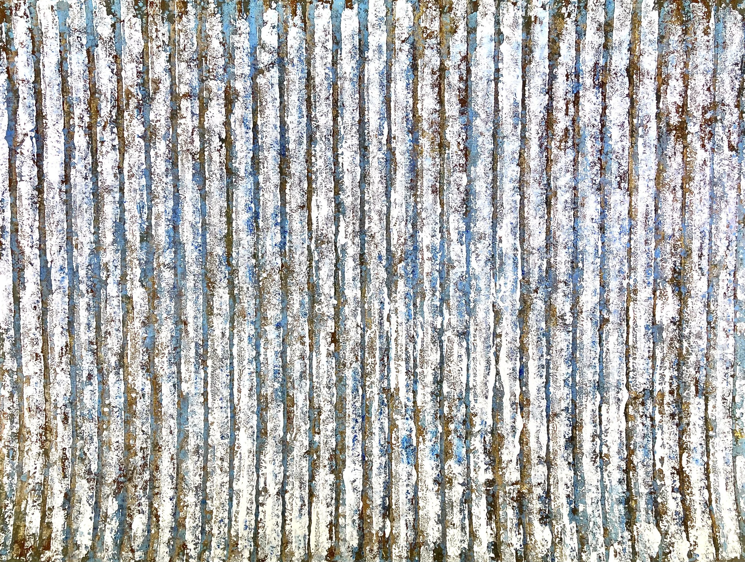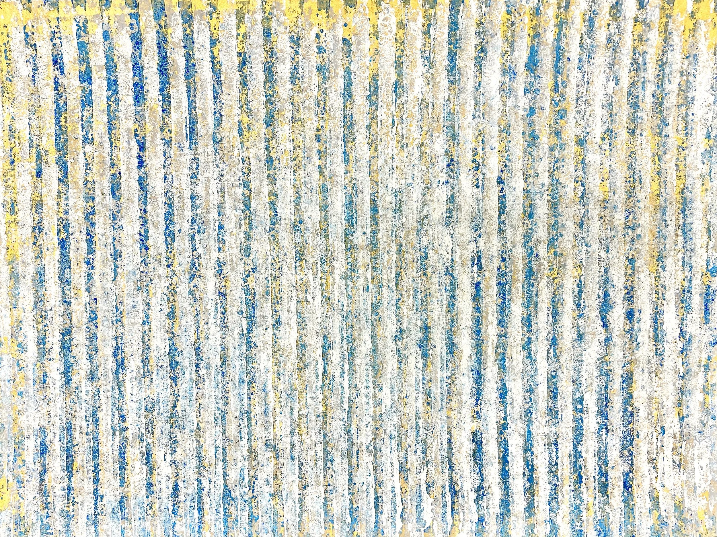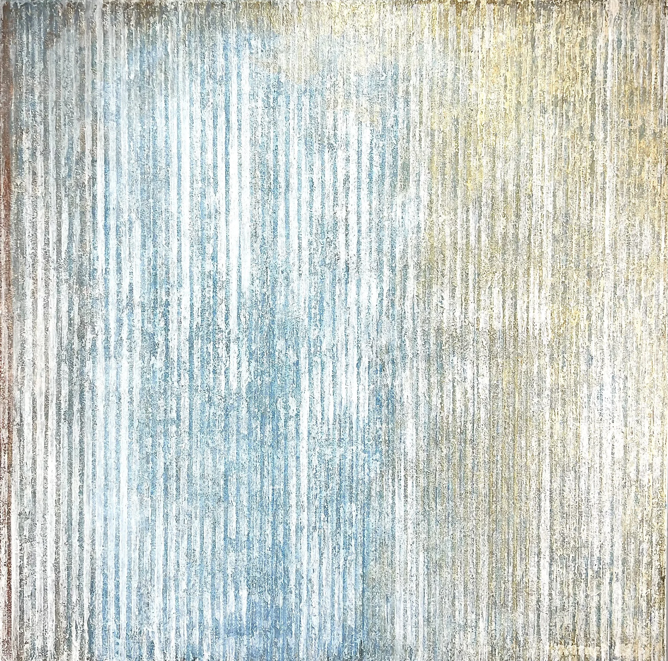 Blinds of White, Gold and Blue Oil on canvas 150 cm x 150 cm x 5 cm (76” x 76”)